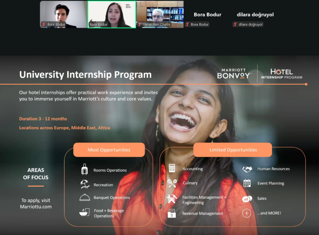 Tourism & Hotel Management Department jointly with its Tourism Club hosted on Tuesday 21.04.2026 an insightful session in collaboration with Marriott International, where students had the opportunity to explore internships, career paths, and the prestegious Voyage Program across the EMEA region. Rima Pradhan and Cenk Koruyucu shared their valuable industry expertise, career journeys, and practical advice on how to succeed in hospitality industry. The session provided a clearer perspective on global opportunities within Marriott International and inspired many attendees to take their next steps with confidence